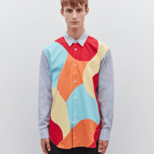 CDG Men’s Curved Patchwork Shirt is a bold fusion of modern style and artistic design, perfect for those who want