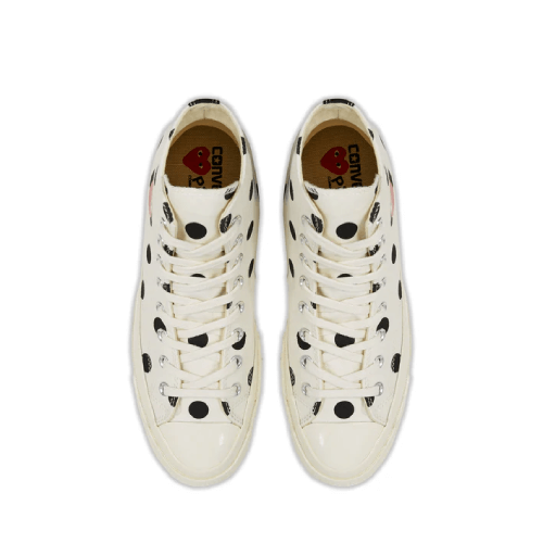 Step into timeless streetwear fashion with the CDG Play Converse Polka Dot Red Heart Chuck Taylor All Star ’70 High Sneakers. This iconic collaboration between Comme des Garçons Play and Converse redefines the classic Chuck Taylor silhouette with a playful yet stylish twist. Featuring the signature black canvas upper adorned with bold white polka dots, these sneakers showcase Rei Kawakubo’s minimalist yet creative design vision. The standout detail is the signature red heart logo with two eyes, instantly recognizable as the emblem of CDG Play.